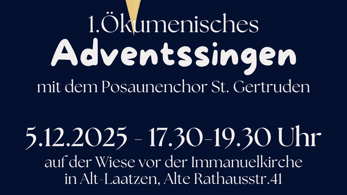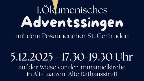 Am Freitag, den 5. Dezember 2025 von 17.30 – 19.30 Uhr veranstaltet die katholische Pfarrgemeinde St. Oliver gemeinsam mit der evangelischen Gesamtkirchengemeinde das 1. Ökumenische Adventssingen in Laatzen auf der Wiese vor der Immanuelkirche in Alt-Laatzen.