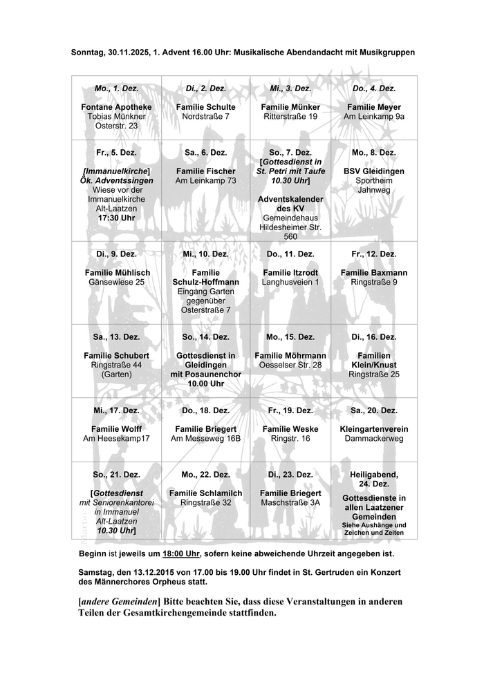 Gemeinsam durch den Advent: In Gleidingen öffnet sich täglich eine neue Tür mit Liedern und Begegnungen. Hier sehen Sie, wo sich das Türchen öffnet.