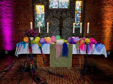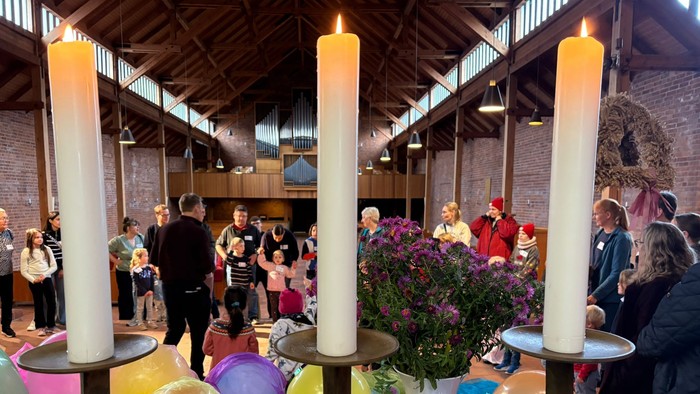 Schon am Eingang zur Immanuelkirche wurden wir mit Musik, Namensschildern und Schokolade begrüßt. Durch einen glitzernden Vorhang ging es hinein ins bunte Treiben, während draußen Seifenblasen durch die Herbstluft tanzten. In der Kirche dekorierten Kinder den ehrwürdigen Altar passend zur Geschichte von der Hochzeit zu Kana – mit bunten Tüchern, Luftballons und sogar einer Hochzeitstorte aus Pappe.