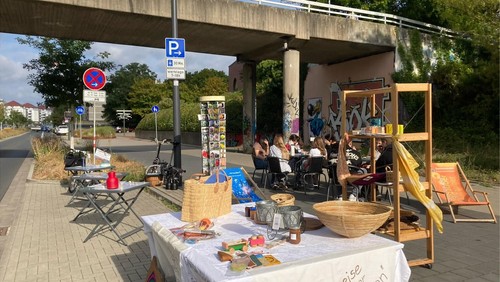 Die ARCHE hat einen „Wohnraum statt Parkplatz“ gestaltet mit ihren diakonischen und umweltschonenden Angeboten, über die man sich an drei Tischen informieren konnte. Herbert Mühlbauer gab vielen interessierten Schülern:innen Erläuterungen dazu.